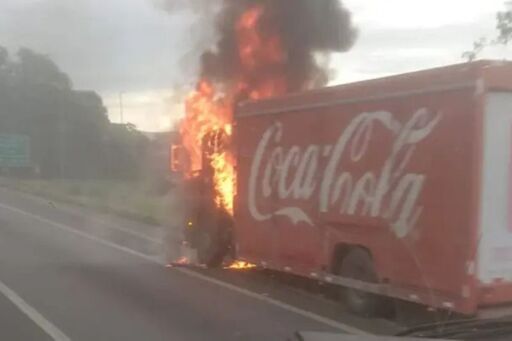 Incêndio destruiu a cabine de veículo com logomarca da Coca-Cola na manhã desta terça-feira; tráfego foi normalizado após atendimento.