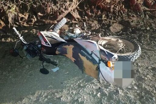 A motocicleta estava caída em uma valeta, com marcas evidentes de queda e o pneu dianteiro furado, mas sem sinais de colisão com barrancos ou obstáculos. Isso sugere perda de controle possivelmente causada pelo furo, comum em estradas rurais com terrenos irregulares e pouca iluminação noturna. A área foi isolada imediatamente para preservar evidências.